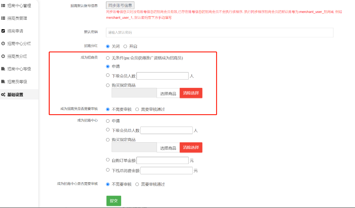 3.设置成为招商中心的条件与成为招商中心是否需要审核。