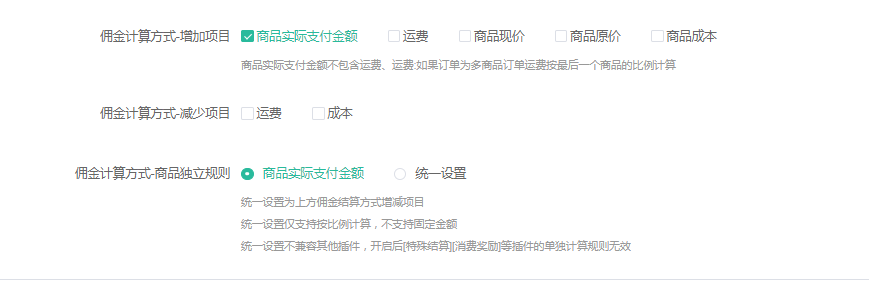选择统一设置则是按照佣金计算方式选择的增加项目和减少项目去进行计算,仅支持按比例计算~