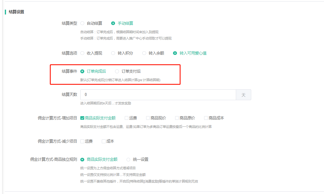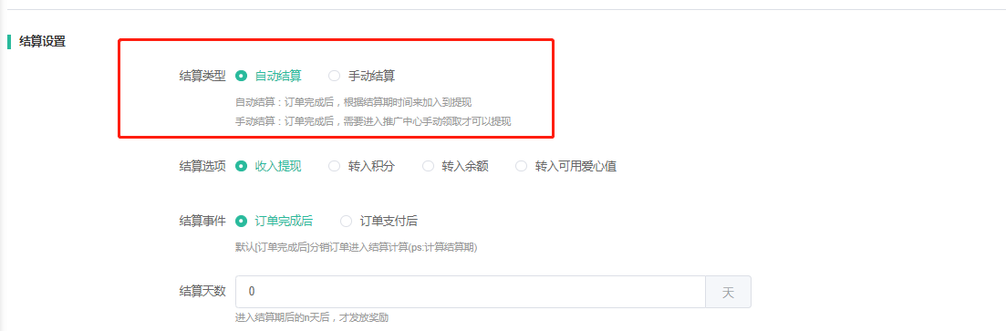 结算天数:设置了天数,当订单完成后满足设置的天数后,前端佣金才能申请提现