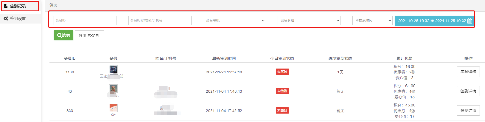1)按会员显示会员的签到记录:会员ID、会员、姓名/手机号、最新签到时间、今日签到状态、连续签到状态、累计奖励;