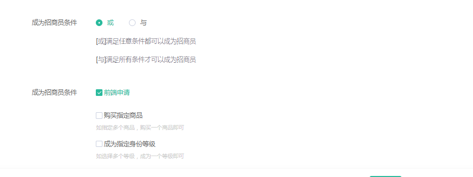 C:指定会员身份等级成为:会员等级、经销商等级、分销商等级,只需满足其中一个身份的一个等级