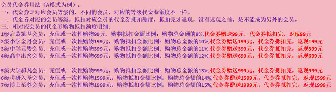 1,会员有代金券时,商品下单会默认使用代金券抵扣,抵扣金额=商品会员折扣后金额x抵扣比例