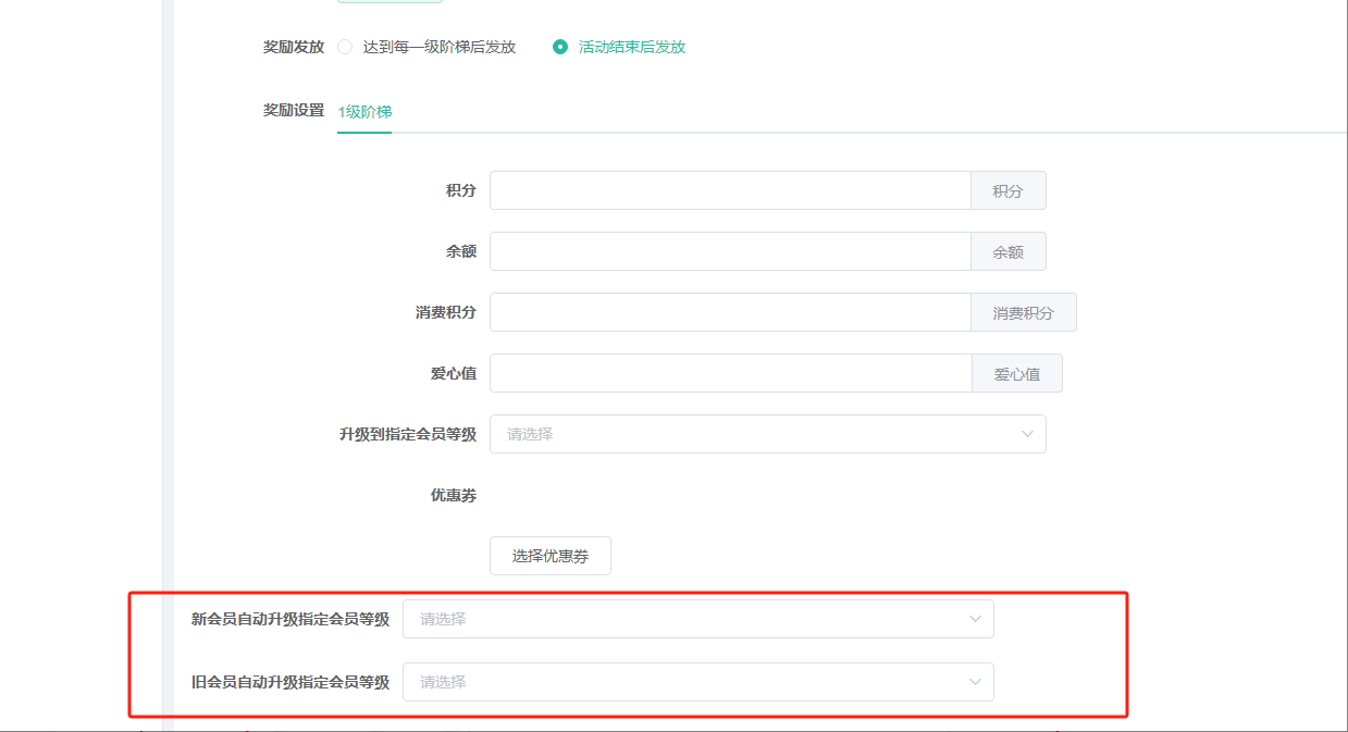 奖励设置:支持奖励积分、余额、消费积分、爱心值、升级到指定的会员等级、优惠券等。