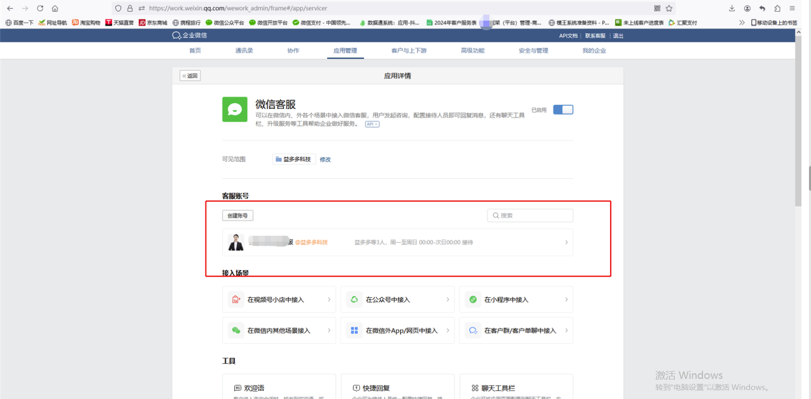 (若发现没有“去接入”按钮,请检查是否“已启用”微信客服)