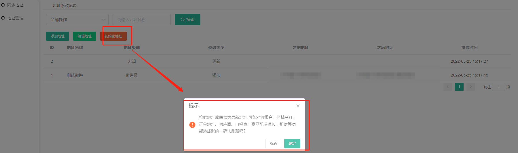 3、初始化地址:将把地址库覆盖为最新地址,可能对收银台、区域分红、订单地址、供应商、自提点、商品配送模板、租赁等功能造成影响;