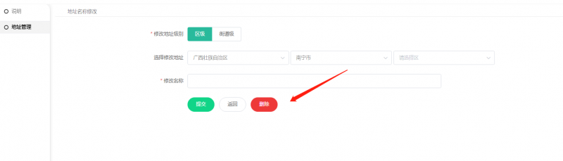 2、编辑地址:修改地址名称,支持修改区级、街道级地址名称。