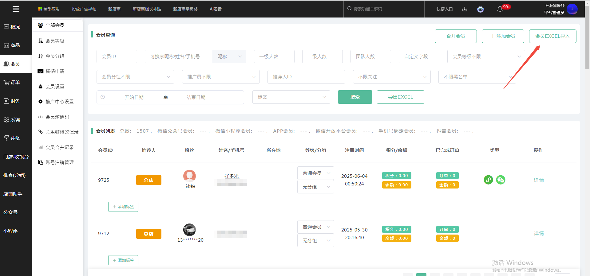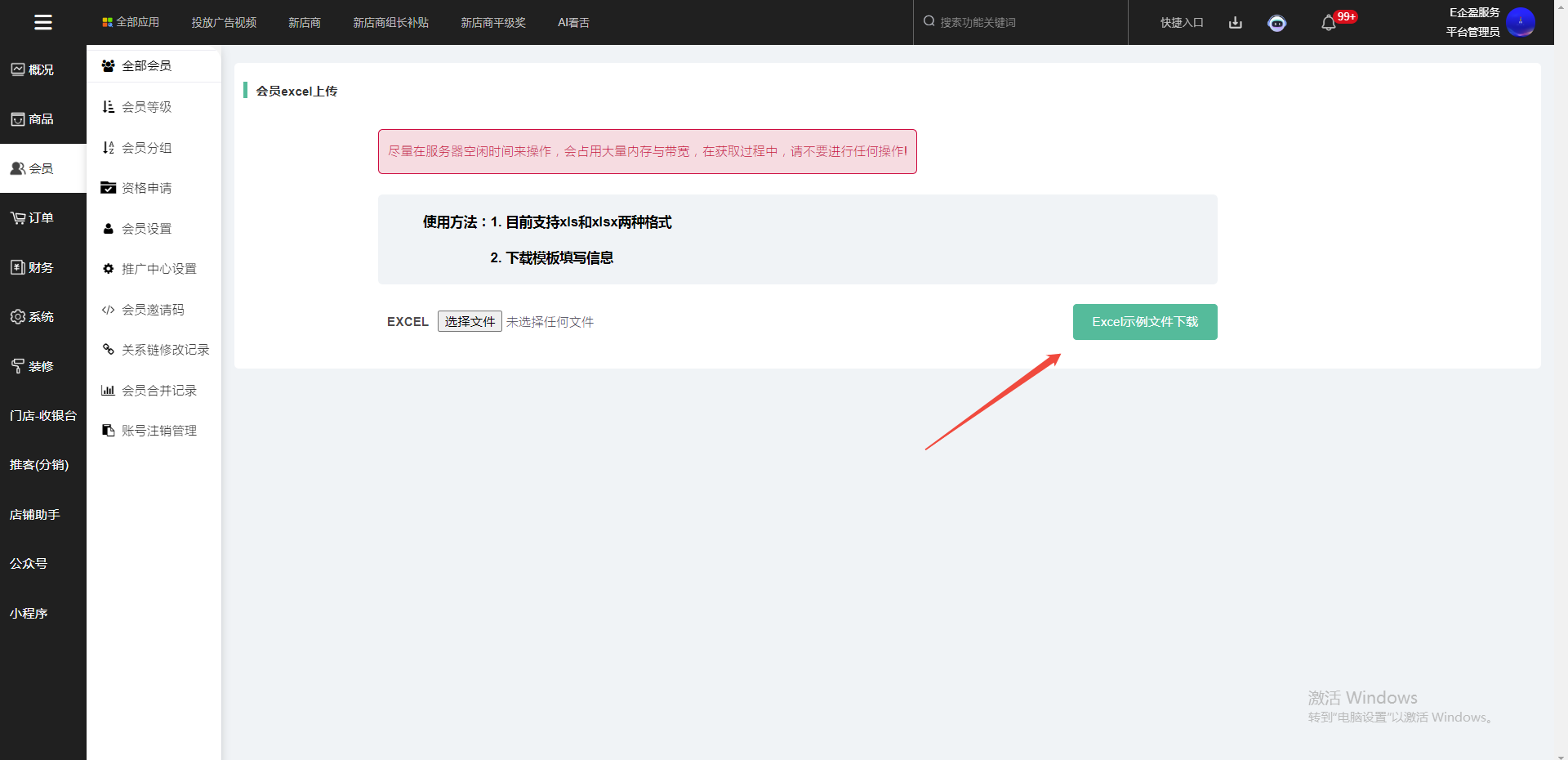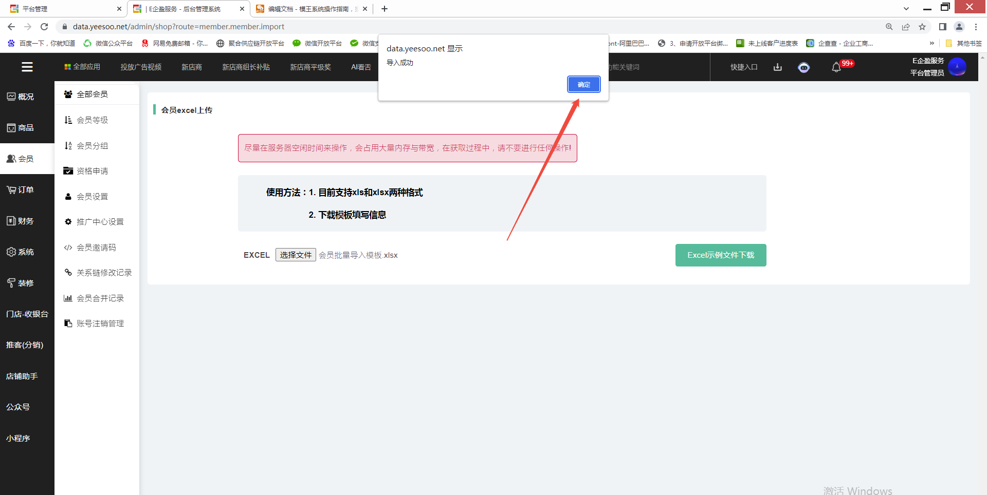 1、第一步,在系统--后台--会员--全部会员--会员EXCEL导入
